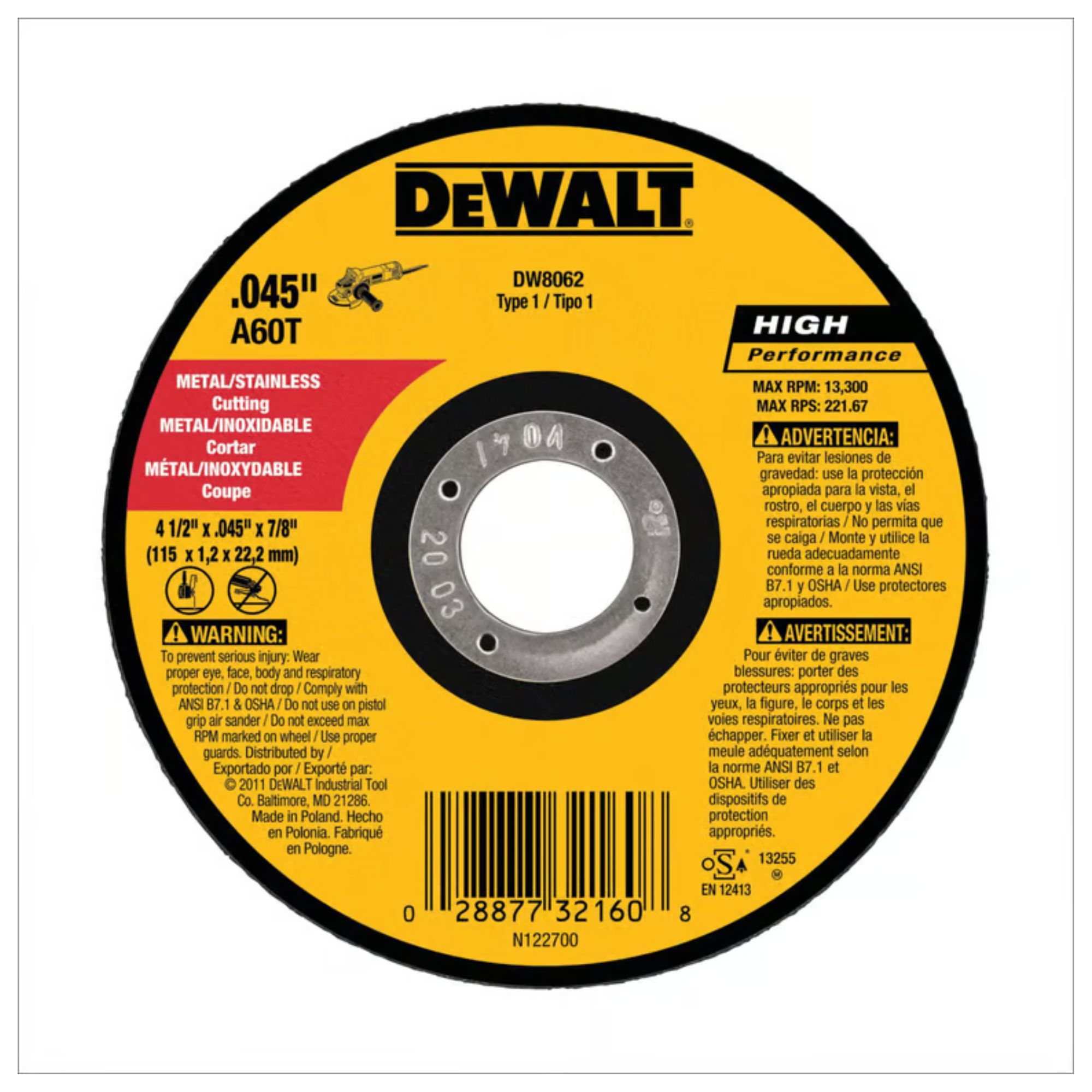 Disco de corte para metal fino DW 4-1/2 x 0.045. Ideal para cortes precisos en aceros suaves, láminas metálicas y tubos delgados. Máximo rendimiento y durabilidad en trabajos de ferretería y metalurgia. SKU: GEABDICOMEB1174