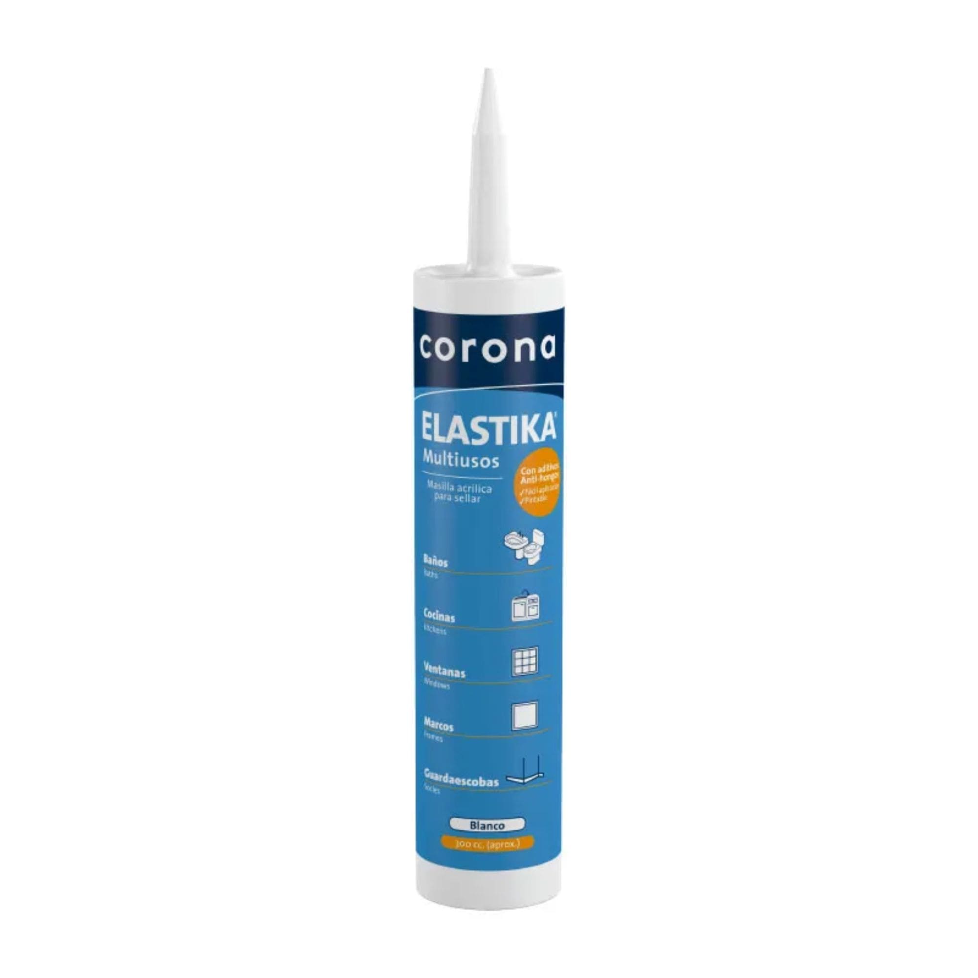 Elastika Blanca Corona en tubo de 300 cc es un sellador elastomérico de alta calidad para construcción. Ofrece máxima elasticidad, adherencia superior y resistencia a la intemperie. Ideal para sellar juntas en diferentes materiales con acabado profesional y duradero.