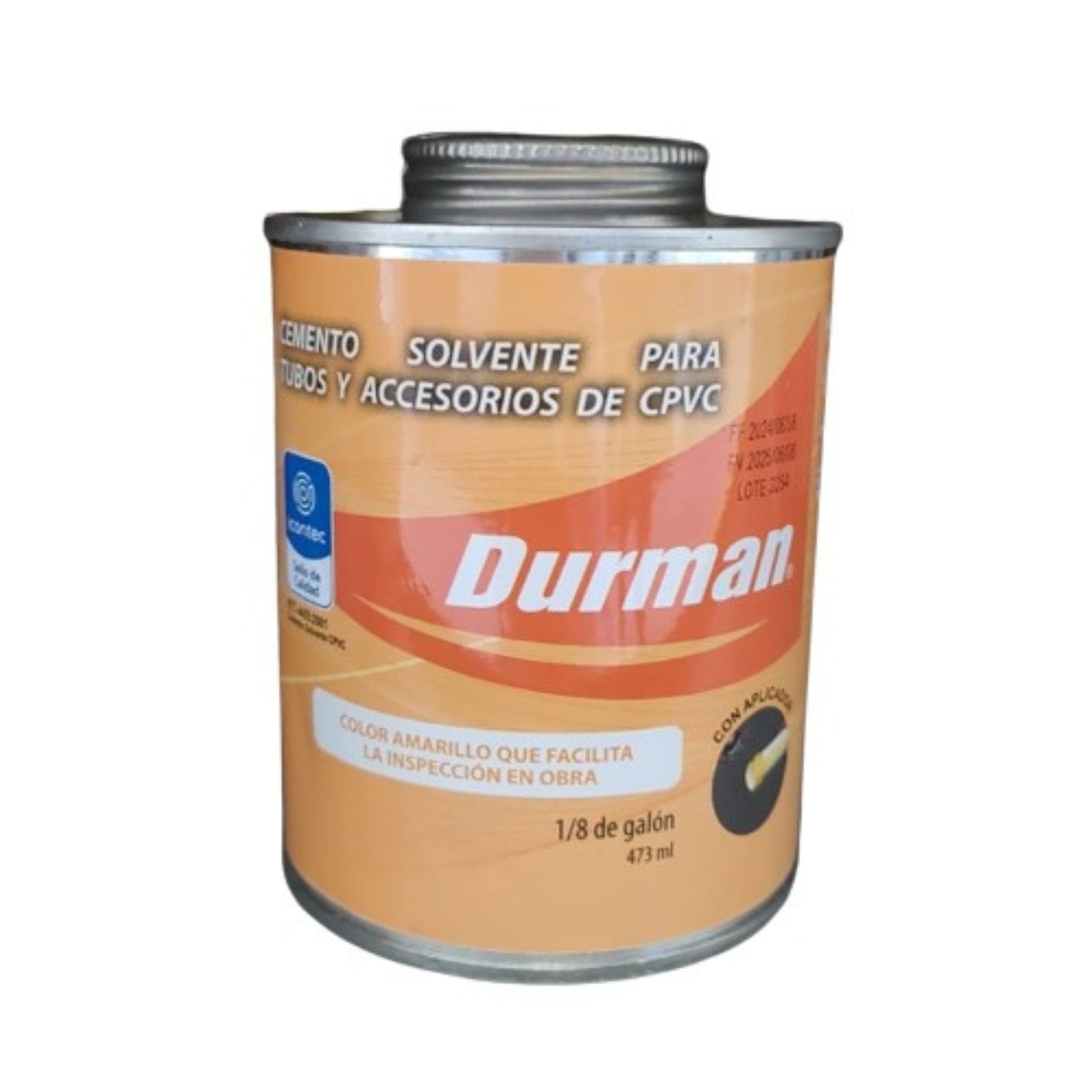 Soldadura CPVC 1/8 (473 cc) Durman – Cemento especializado para uniones permanentes en tuberías y conexiones CPVC. Ofrece máxima resistencia y estanqueidad en sistemas de agua caliente y fría. Fórmula profesional que garantiza uniones seguras y duraderas, ideal para instalaciones residenciales e industriales.