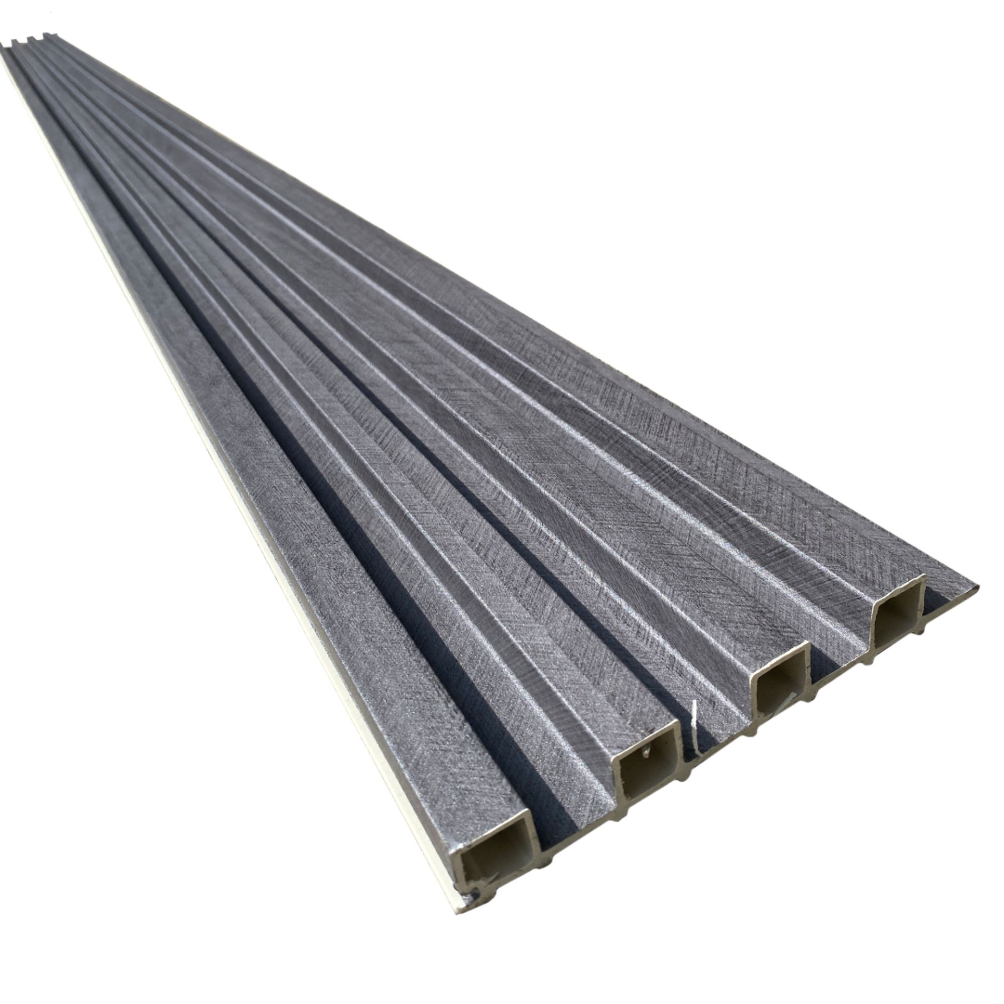 Panel WPC gris mallado 2.9×16.7 cm GSP, material compuesto de madera y plástico de alta durabilidad. Ideal para revestimientos decorativos exteriores e interiores. Resistente a la humedad, insectos y condiciones climáticas adversas. Perfecto para fachadas, terrazas y proyectos de diseño sostenible.